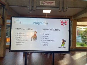 Mit viel Engagement führten unsere Viertklässler die neuen Kinder und deren Eltern durch das Schulgebäude und über den Schulhof. Dabei konnten die Gäste nicht nur viele Klassenzimmer besichtigen, sondern auch weitere Räume entdecken: den Musikraum, den Bewegungsraum oder auch unseren Schulgarten. In der Turnhalle lud dann ein spannender Parcours zum mitmachen ein.
